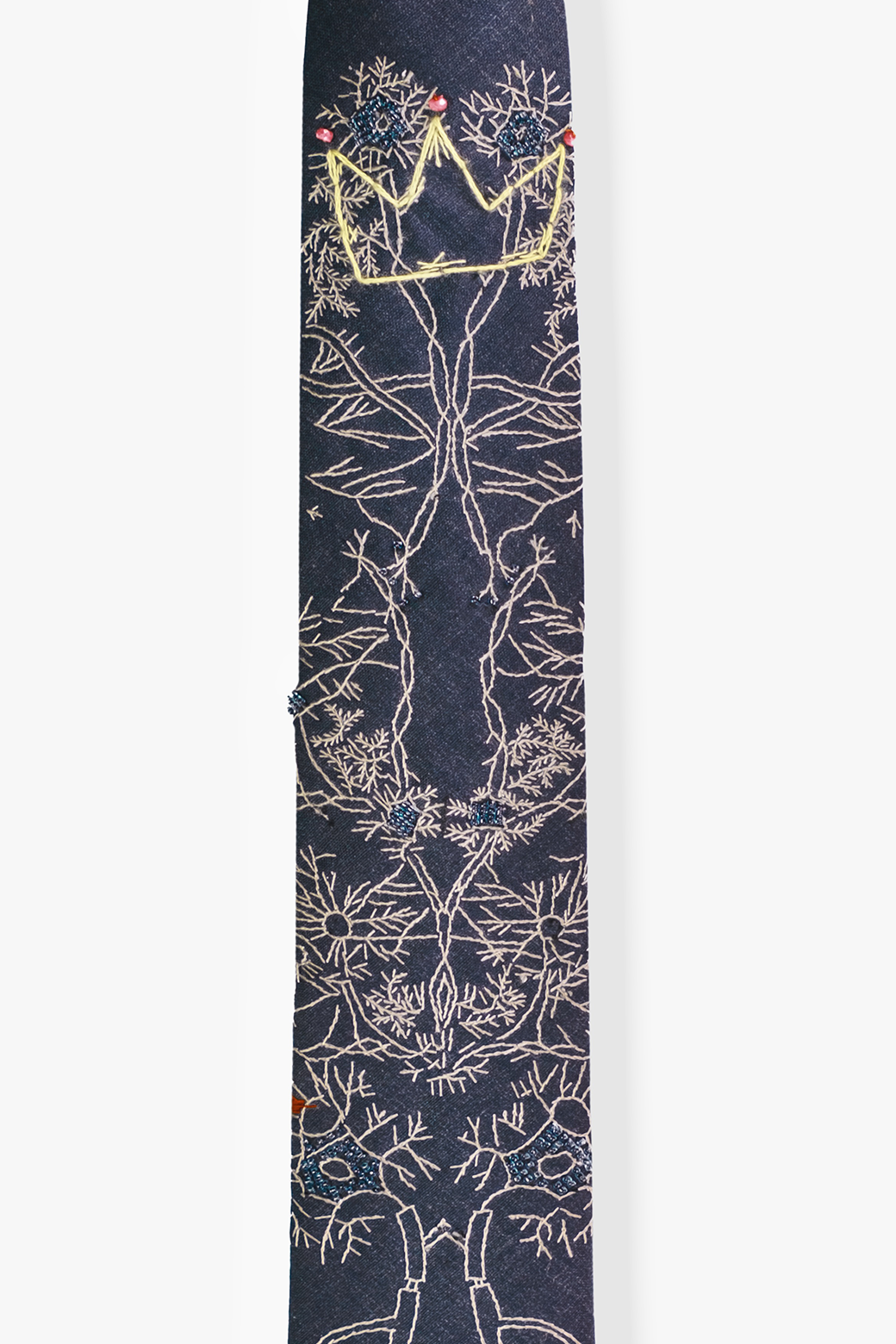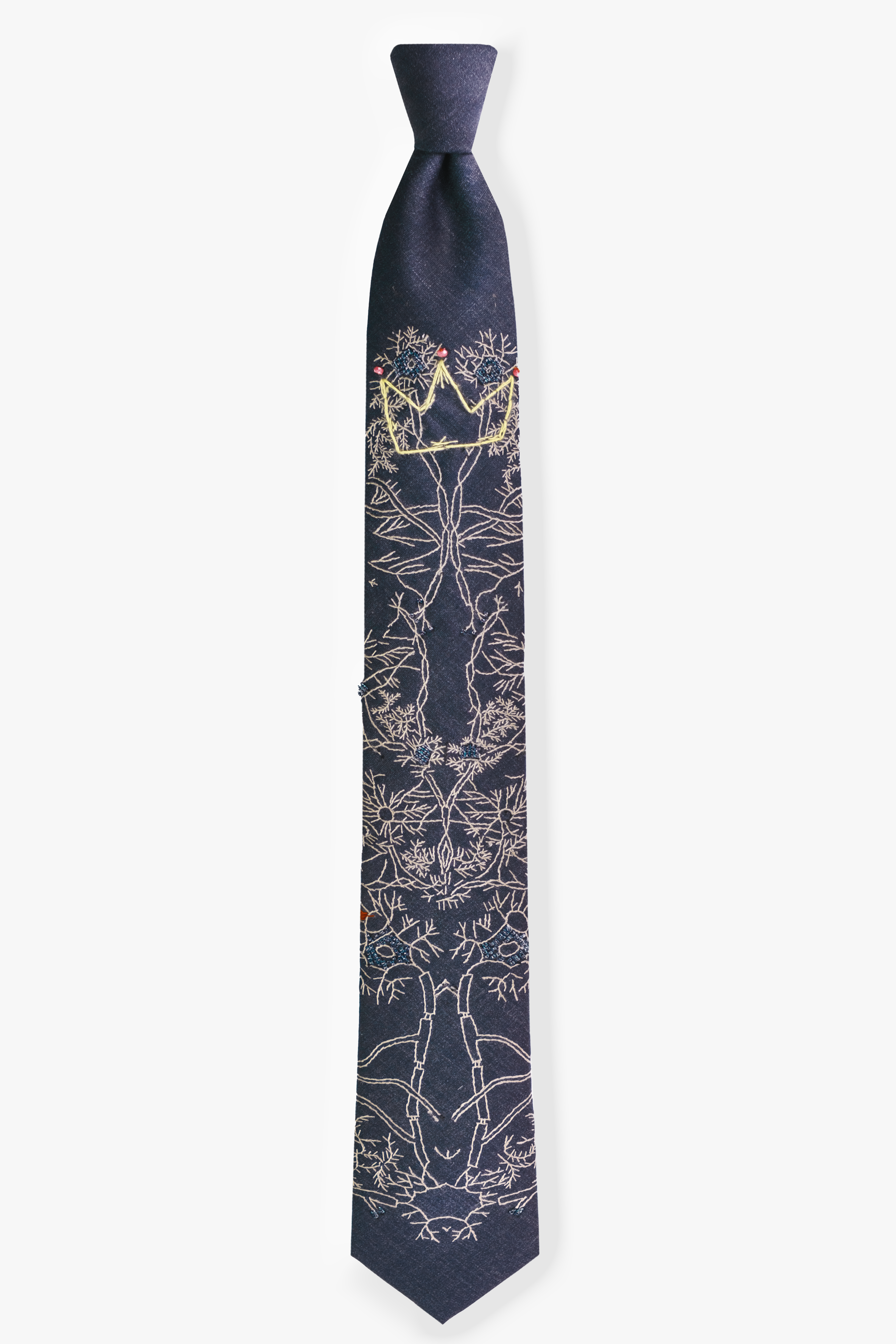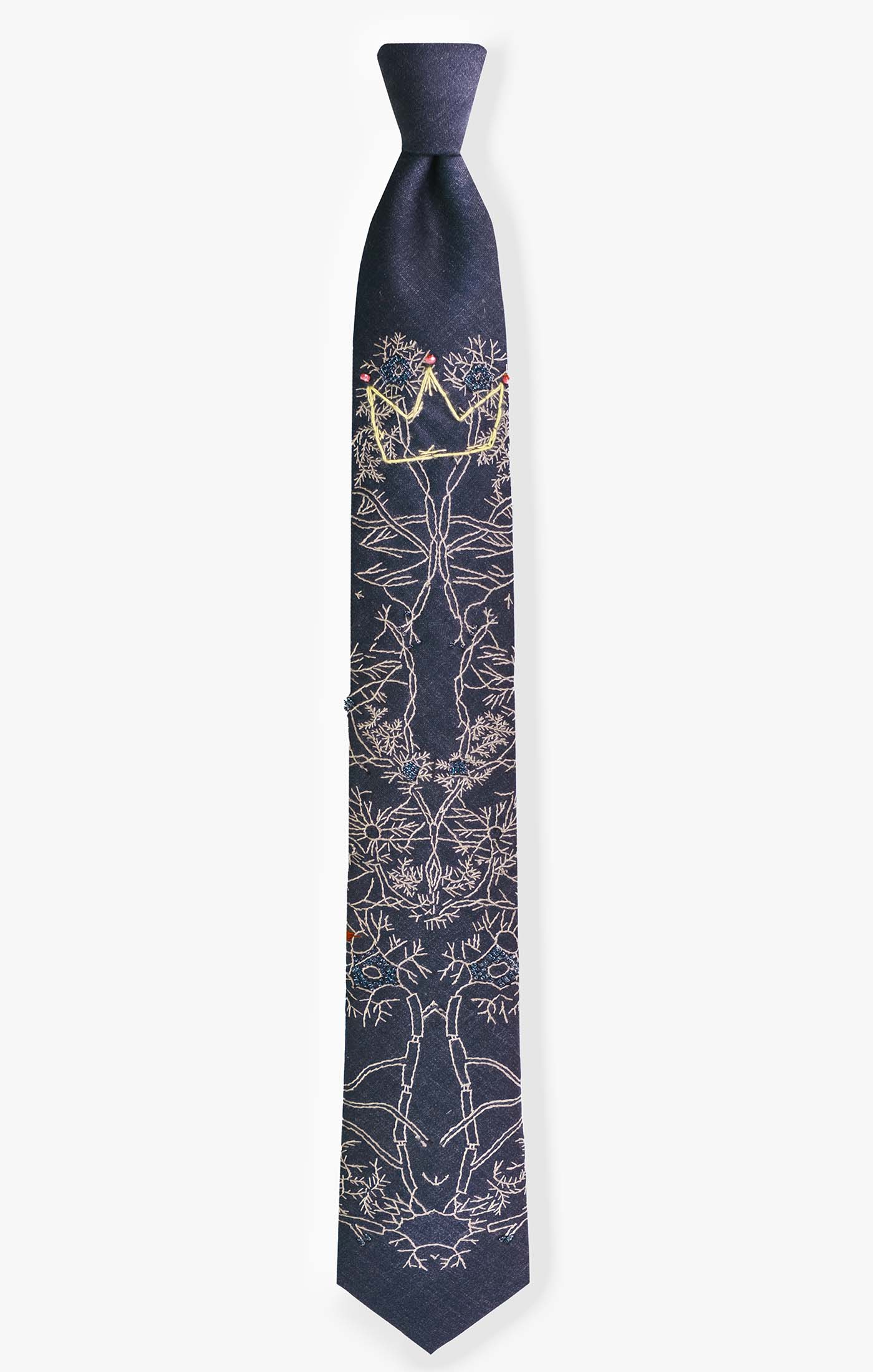 intricately hand beaded and embroidered with an intracellular motif. this tie is finished with an embroidered crown and 3 rubies.