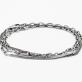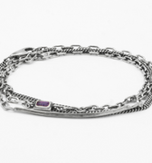this sterling silver multi wrap bracelet features varied cable chains, a hand forged silver bar and emerald-cut amethyst gemstone.
