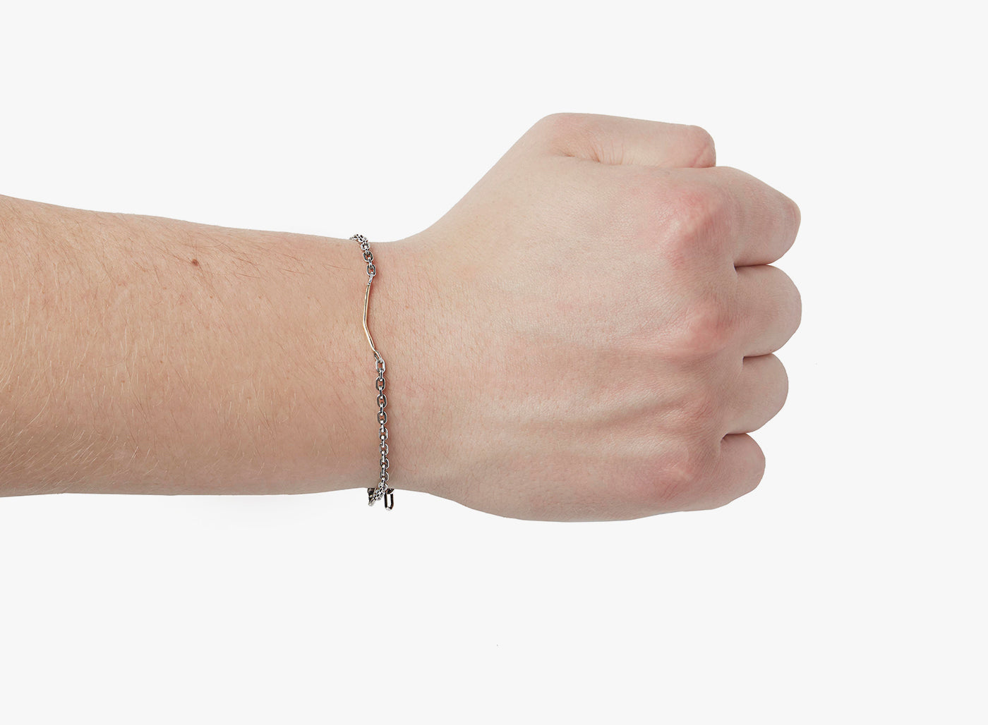 this adjustable bracelet features an 18k gold hand forged bar that connects a sterling silver micro cable chain.