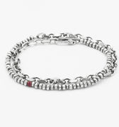 this adjustable, double wrap bracelet features a strand of sterling silver beads that connect to a diamond cut cable chain, and is finished with our signature ruby.