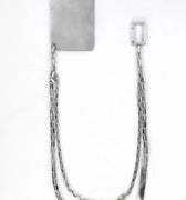 this wallet chain is composed of a double box chain that connects to a hand forged 3' bar, a bezel set peridot, and finished with our custom box clasp. it attaches to a solid sterling silver credit card that fits in any standard wallet.