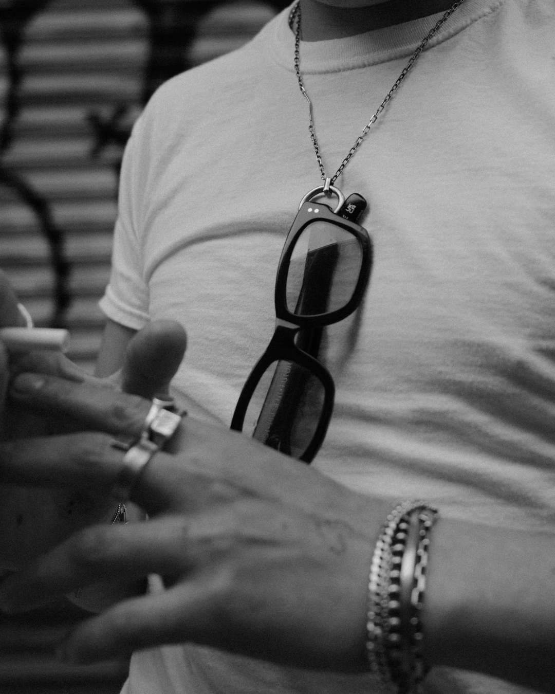 this sunglass holder is made from a sterling silver anchor chain and is disrupted by a hand forged bar.