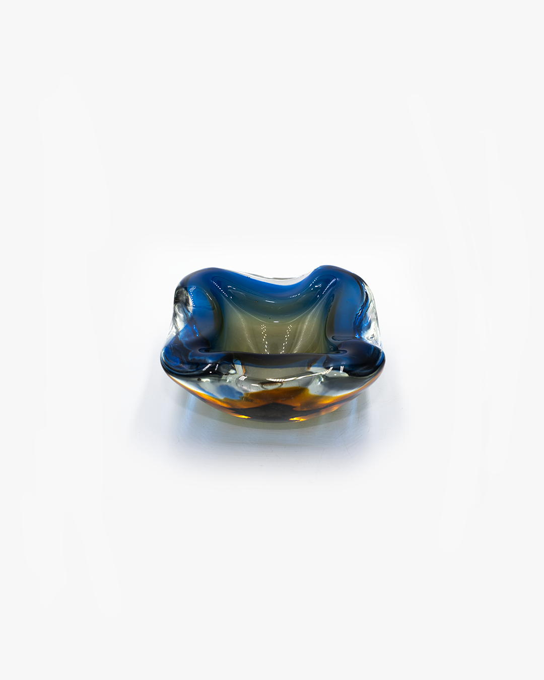 this beautiful murano cosmic blue to amber ashtray was created in murano italy in the 1960's.